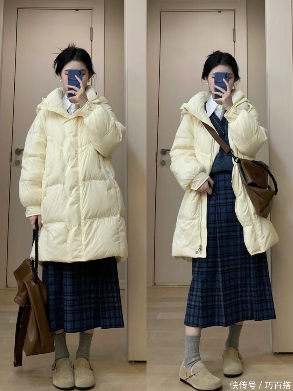 想要带给东说念主更惊艳的嗅觉,各人可以遴荐长羽绒长于半身裙的形式,半身裙澈底瞒哄在长羽绒之下,室内造型是紧身打底+高腰百褶短裙,室外造型是长羽绒+光腿神器或黑丝,氛围感满满。